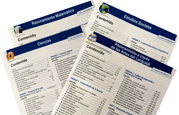 Entre los libros que tienen contenidos de todas las materias esta el de STECK-VAUGHN aun cuando es de la versión pasada, los contenidos y temas son parte de los temas que se recomienda estudiar para el nuevo examen. ESTE LIBRO NO LO COMPREN EN AMAZON, PORQUE LO VENDEN SUMAMENTE CARO, si lo encuentrar a menos de $30 dólares vale la pena, sino traten de buscarlo en una biblioteca y alquilarlo.