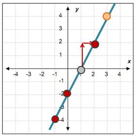 Elegir un par de coordenadas y aplicar el método para obtener la pendiente visualizando un triángulo rectángulo. Se cuentan las unidades (cuadros en y) y las unidades en x. Se representan en forma de fracción poniendo el valor en «y» en el lugar del numerador y el de «x» en el lugar del denominador.